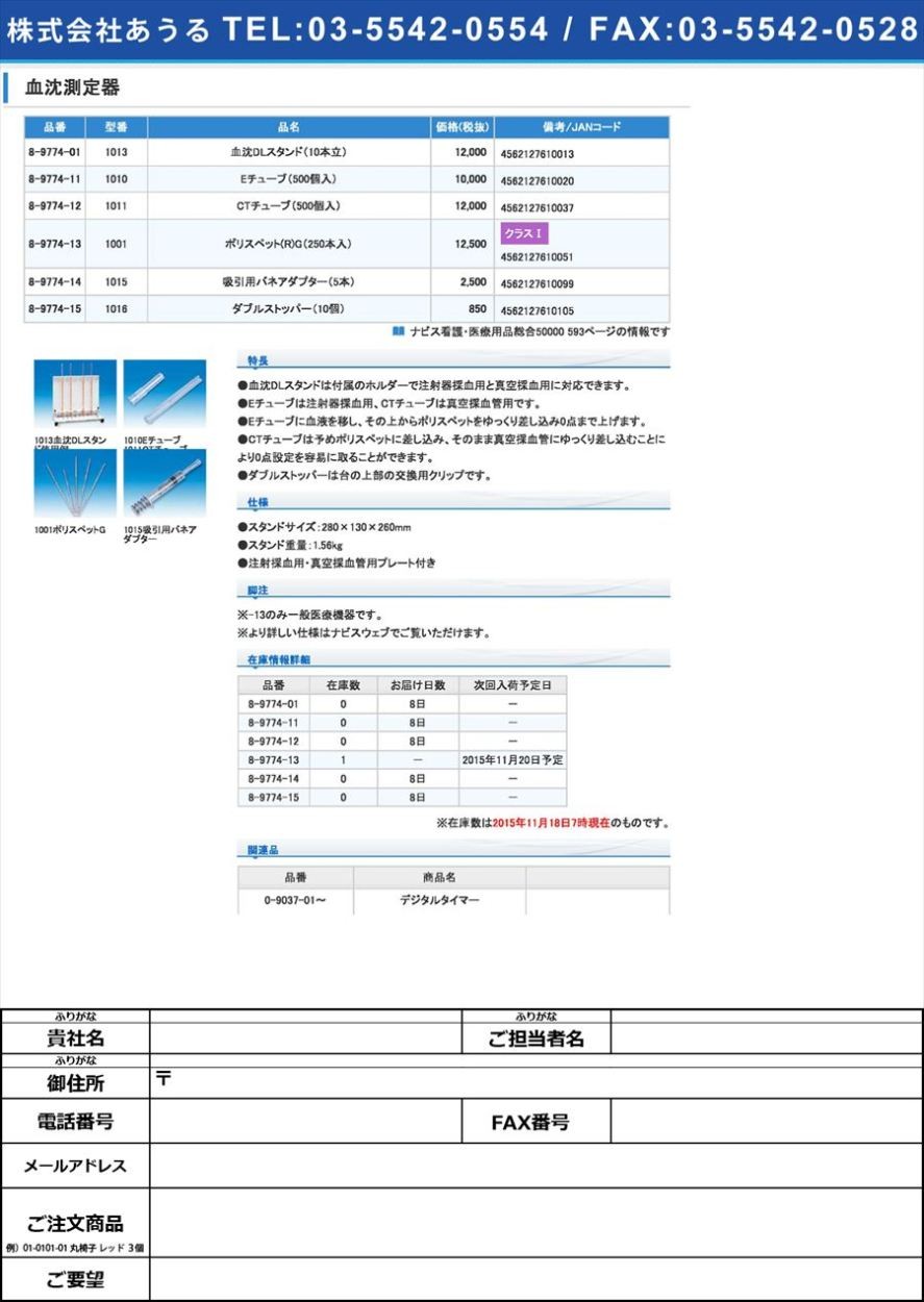 8-9774-12血沈測定器CTチューブ(500個入)1011のカタログはこちら<※クリックすると拡大します。ご注文書としてもご利用ください。(FAX送信先: 03-5542-0528 株式会社あうる)