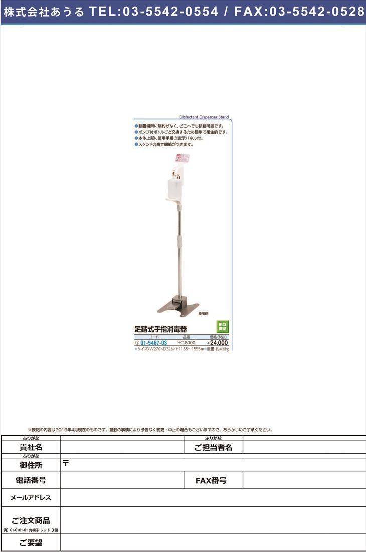 【※欠品中 納期未定※】足踏式手指消毒器 HC-8000(270X326X1155 アシブミシキテユビショウドクキ(01-5467-03)【1台単位】