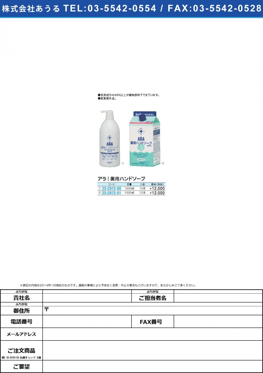 アラ!薬用ハンドソープ(ボトルタイプ アラヤクヨウハンドソープ(ボトル(23-2872-00)1000ML(10ホン)のカタログはこちら