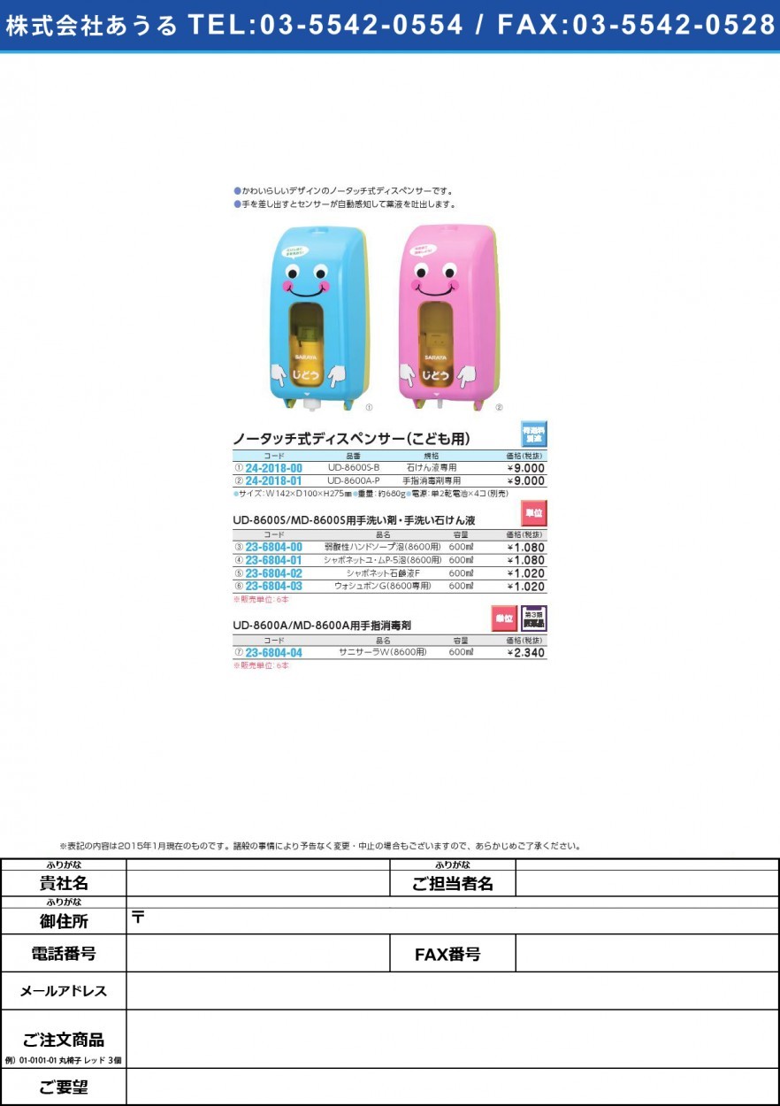 ノータッチ式ディスペンサー(こども用 ノータッチシキディスペンサーコドモ(24-2018-00)UD-8600S-B(セッケンエキヨウ)のカタログはこちら