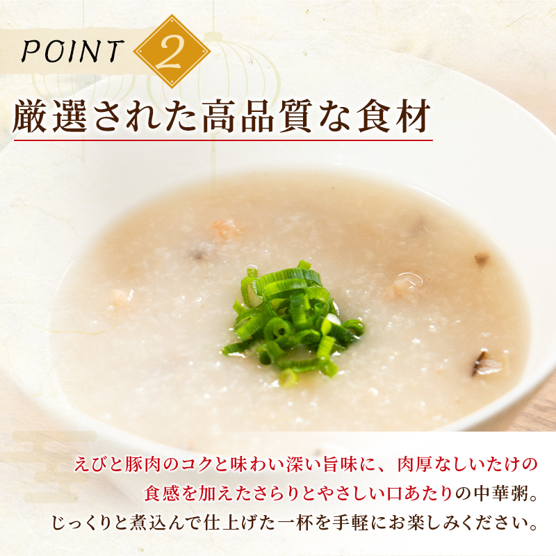えびと豚肉のコクと味わい深い旨みに、肉厚な椎茸の食感を加えてさらりとやさしい口あたりの中華粥。じっくりと煮込んで仕上げた一杯を手軽にお楽しみください。