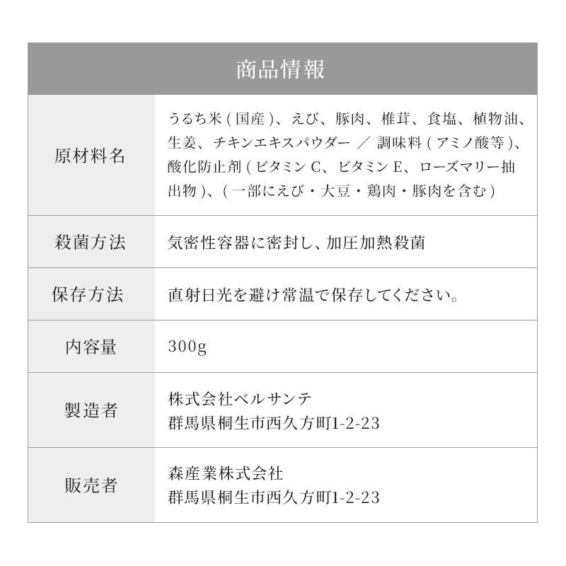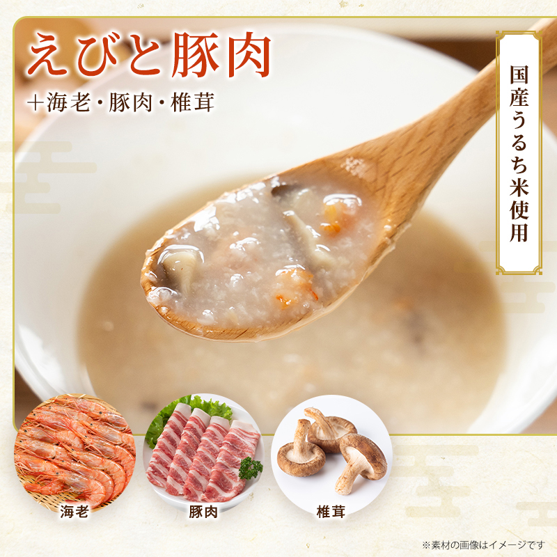 【原材料】えびと豚肉ときのこの中華粥うるち米(国産)、えび、豚肉、椎茸、食塩、植物油、生姜、チキンエキスパウダー/調味料(アミノ酸等)、酸化防止剤(ビタミンC、ビタミンE、ローズマリー抽出物)、(一部にえび・大豆・鶏肉・豚肉を含む))