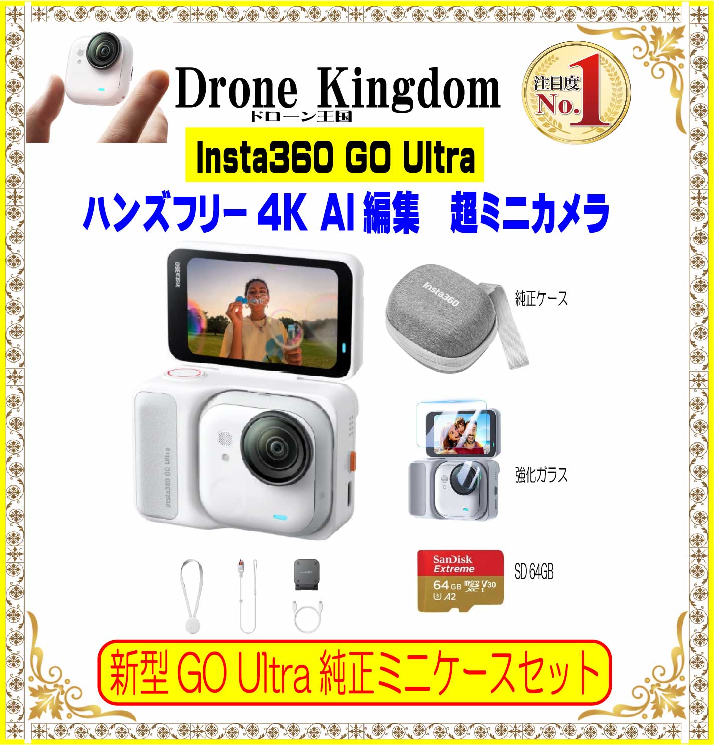 【セール!9800円引き!数量限定】Insta360GO Ultra本体(白)+メモリ64GB+純正ミニケース+強化ガラス