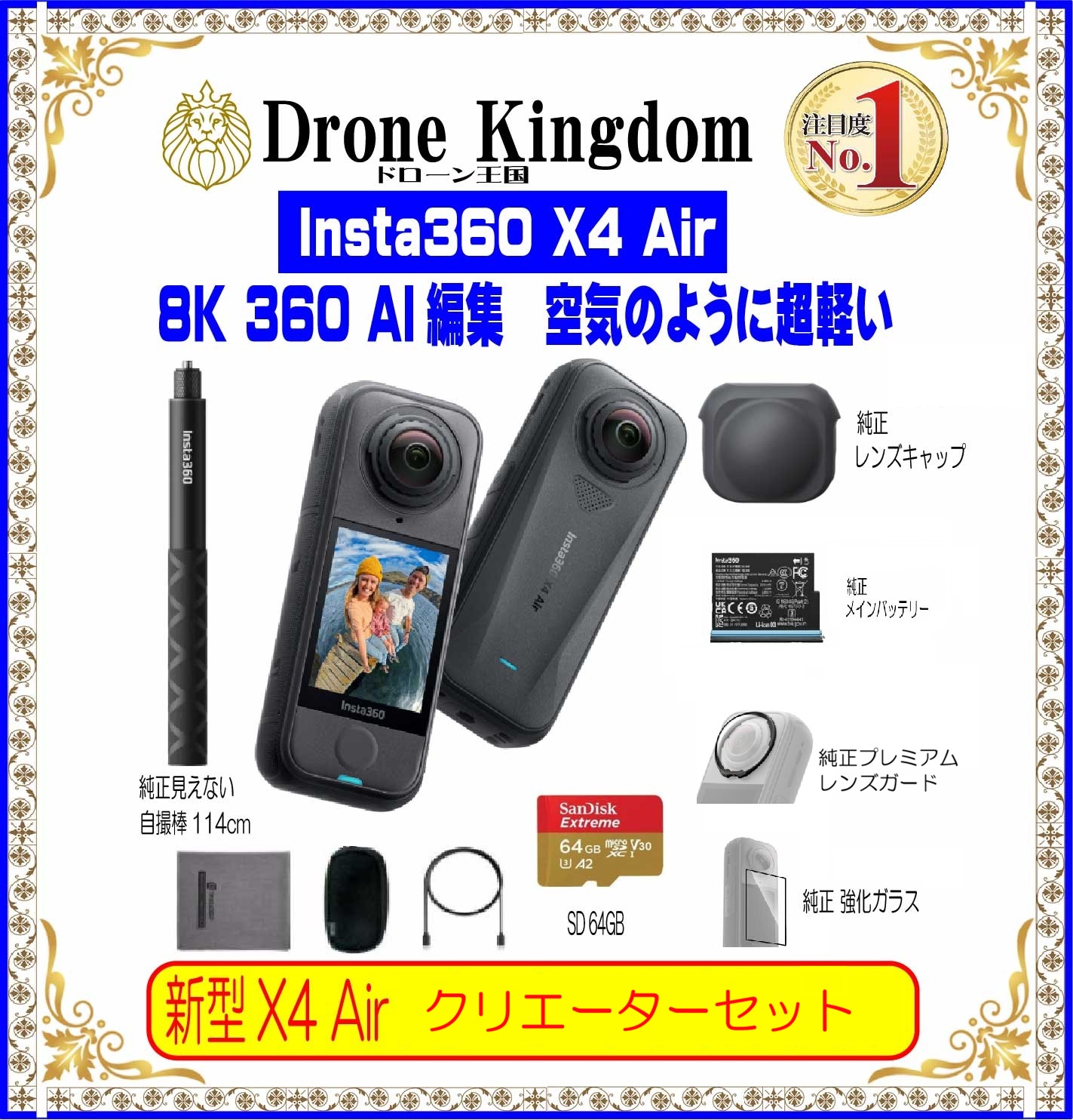 【あすつく!超軽い!数量限定】新型Insta360 x4 Air本体+黒自撮棒114cm+X4キャップ+プレミアムレンズガード+純正スクリーンプロテクター+メモリ64GB
