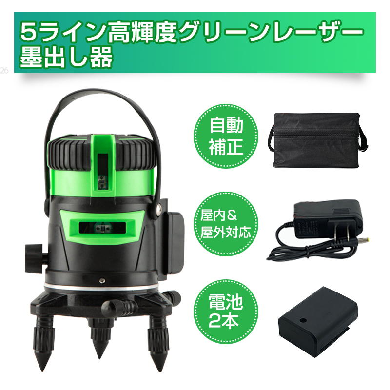 墨出し器 5ライン 水平器 レーザー グリーンレーザー バッテリー2本付き 水平 垂直 コンパクト 高輝度 屋内 屋外 建築 防塵 防水 傾斜 アラーム 自動補正