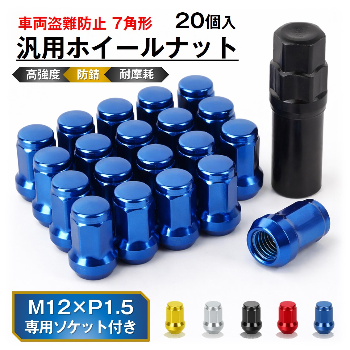 ホイールナット 20個 7角 ヘプタゴン ロックナット M12×P1.5 スチール 袋ナット ラグナット 盗難防止 防犯対策 汎用 車 自動車 テーパー 60度 専用ソケット付き