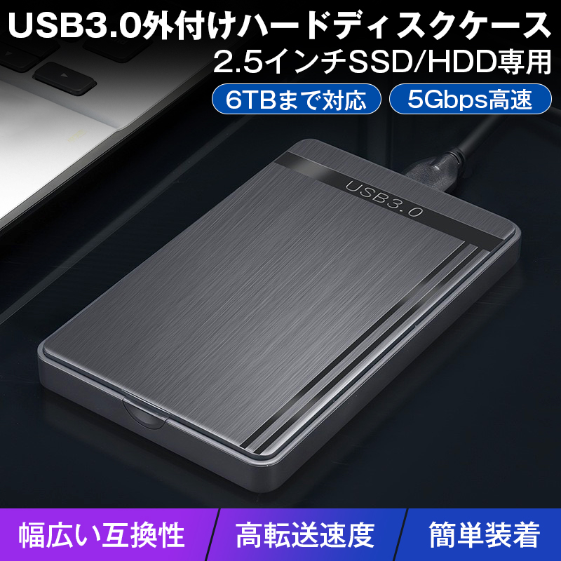 外付けハードディスクケース 2.5インチ HDD/SSD対応 USB3.0 高速転送 電源不要 薄型 軽量 ポータブル ケース 最大6TB対応 Windows Mac テレビ録画対応 簡単装着