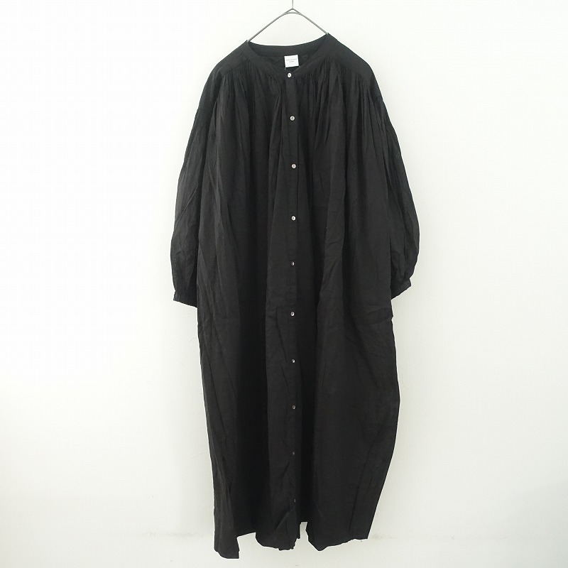 カラーなど:URBAN RESEARCH DOORSのバンドカラーギャザーバルーンスリーブワンピースです。カラーはブラックです。コットンボイル風の軽やかな薄手生地を使用。程よい艶・少し透け感のある素材です。フロントボタン開きのコートドレスです。ネックライン・前後肩ヨークの下・袖山・袖口にたっぷりギャザーが寄せられ、袖口は軽くゴム入りです。両サイドにシームポケットがございます。