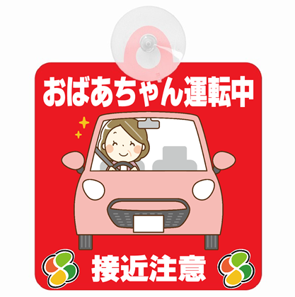 セーフティサイン おばあちゃん運転中 接近注意 レッド イラスト かわいい 高齢者マーク シルバーマーク 安全運転 吸盤 送料無料