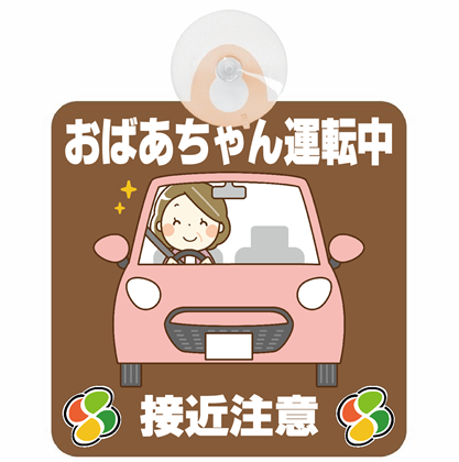 セーフティサイン おばあちゃん運転中 接近注意 ブラウン イラスト かわいい 高齢者マーク シルバーマーク 安全運転 吸盤 送料無料
