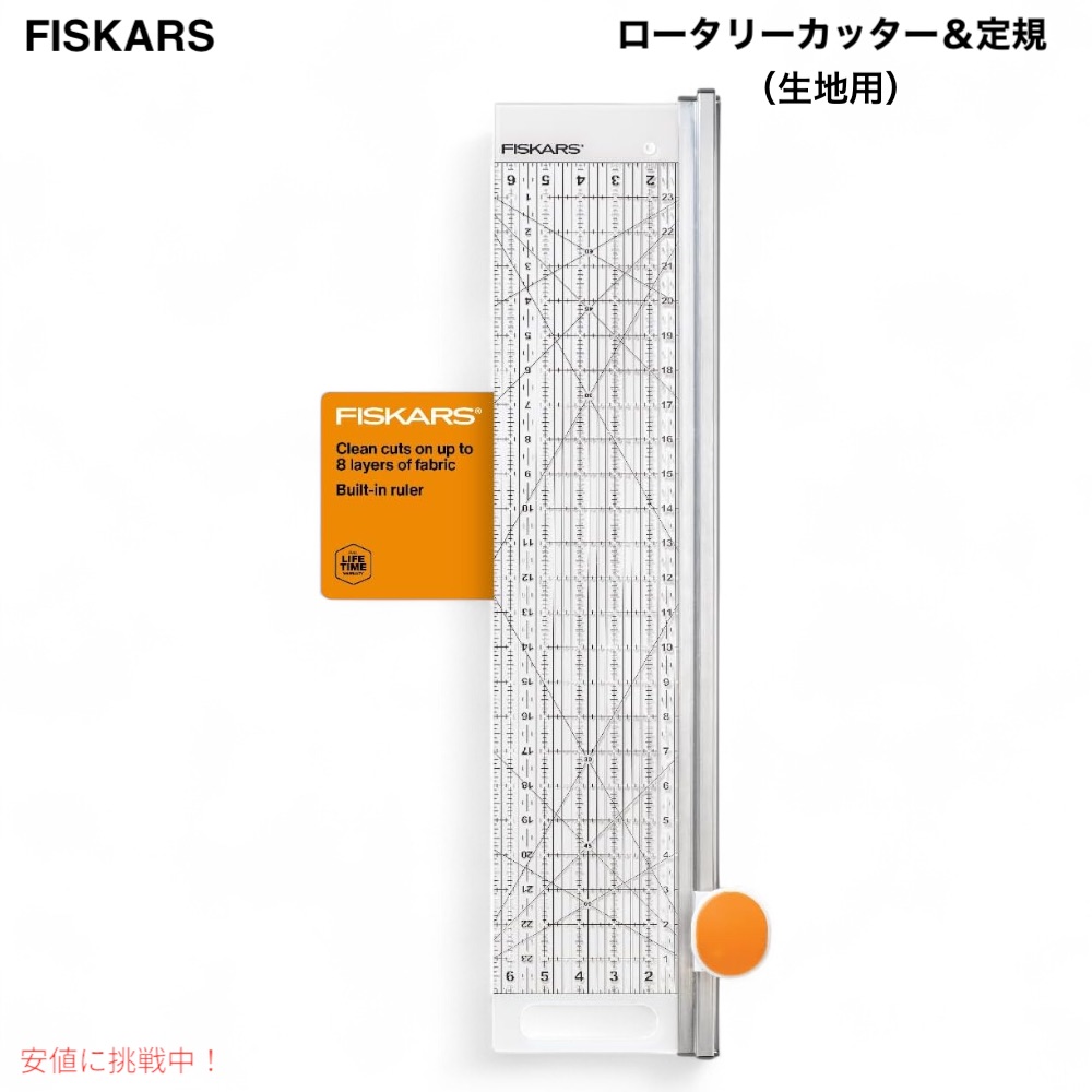 フィスカース ロータリーカッター&定規セット Fiskars 195130-1001ファブリックサイズ 7.1×20.3×71.1cm組み込み式のルーラーには、明るい色の布地や暗い色の布地でも見やすい数字が強調表示された6インチx 24インチの測定表示があります。測定表示は左右にはっきりと印刷されており、右利きと左利きで簡単に使用できます。バイアス(斜め)線により、切断前に角度を簡単に測定できます。ストリップカット、長いカット、三角形などの基本的な形状のカットなどの生地を正確できれいにカットするのに最適です。特別設計されたハンドルと45 mmの回転刃により、生地の複数の層をスムーズかつ確実に切断します。