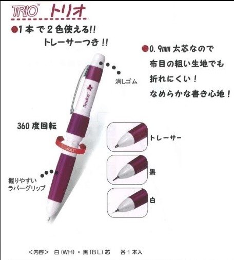 黒は淡色布、白は濃色布、トレーサーは手芸用複写紙などに使用したり、布地を強く押して書く事で跡をつけたりすることも出来ます。
