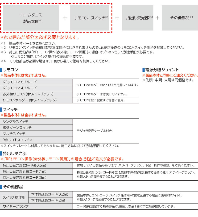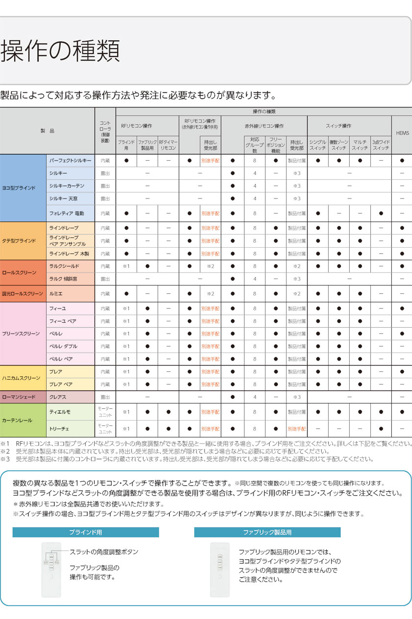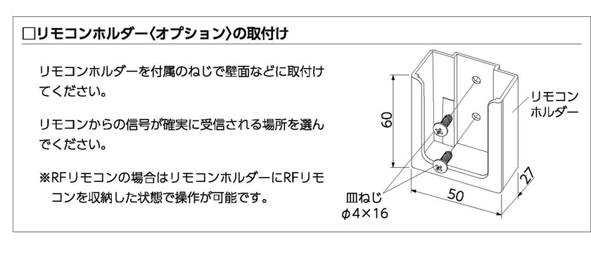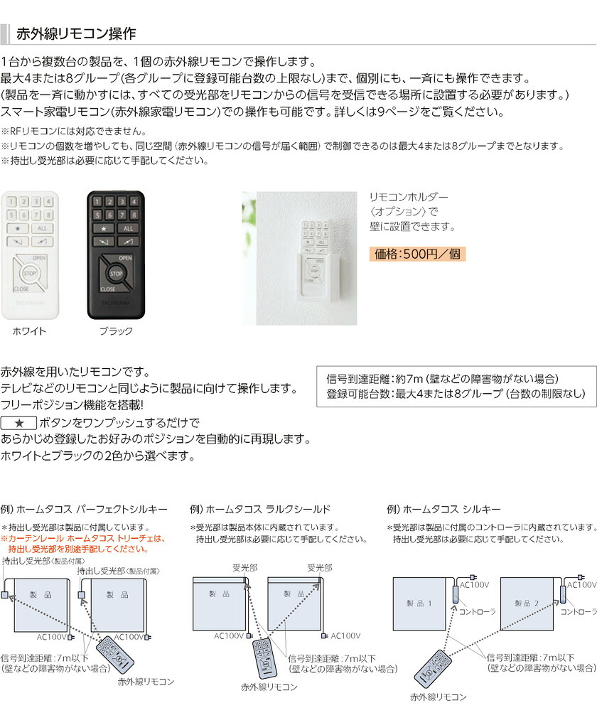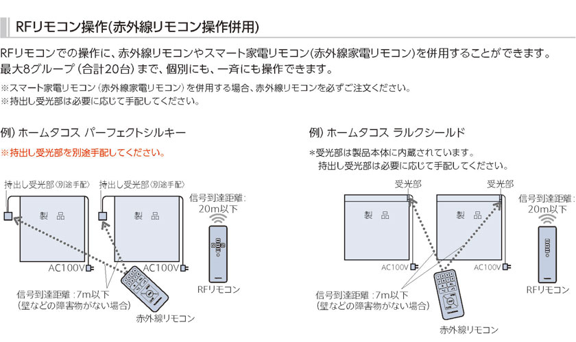 | 備考 | 信号到達距離:20m以下 製品にリモコンを向けなくても操作可能 RFリモコンで操作する場合は最大8グループ(登録可能台数20台)まで操作可能 (赤外線リモコン併用など、RFリモコン以外での操作時は最大4グループまで) ※スマート家電リモコン(赤外線家電リモコン)を使用する場合、RFリモコン操作(赤外線リモコン併用)と同様に、赤外線リモコンと持出し受光部を別途ご注文ください。 付属品:単4乾電池 RFタイマーリモコン(カーテンレール用) 信号到達距離:約20m(見通し距離) 最大6グループ(合計20台)まで、個別にも、一斉にも操作可能。 ウィークリータイマー(曜日・時間): 10件(最大) |
