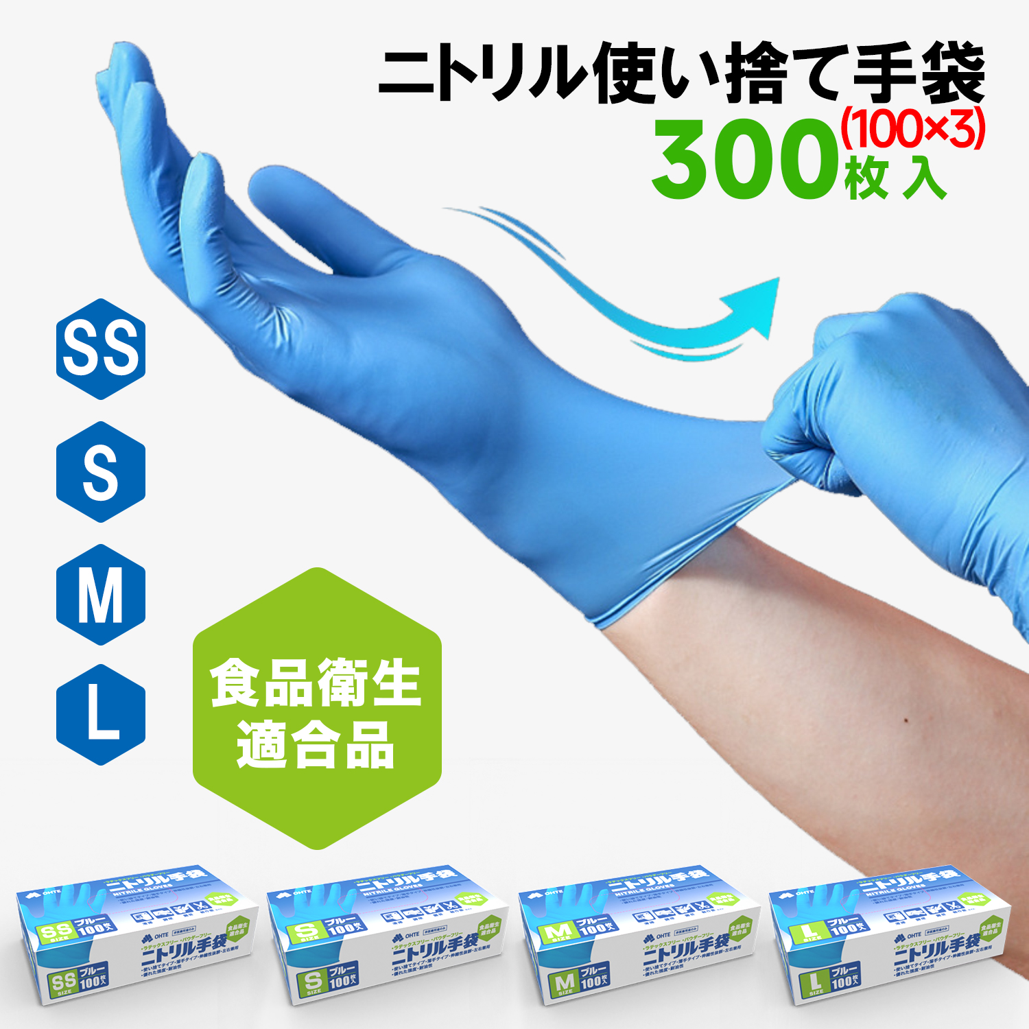 ニトリル手袋 ブルー 使い捨て手袋 100枚x3箱セット 300枚 SS/S/M/Lサイズ 食品衛生適合 ラテックスフリー パウダーフリー OHTE 食品加工 調理 作業 爆買
