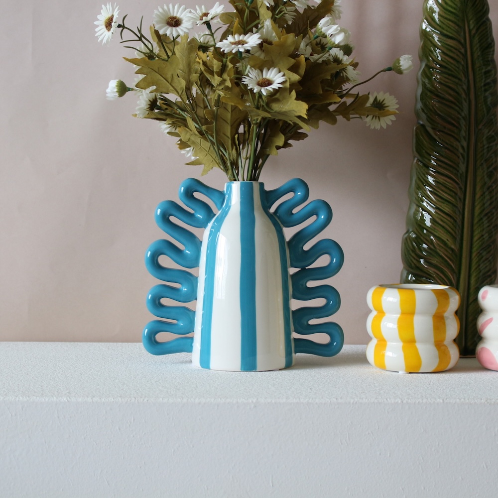 ブルーストライプと立体的なフォルムが目を引き、置くだけで空間を華やかに演出してくれます。花を飾るフラワーベースとしてはもちろん、オブジェとしてそのまま飾っても絵になる存在感。北欧インテリアや韓国インテリア、モダンなお部屋のアクセントにもおすすめです。