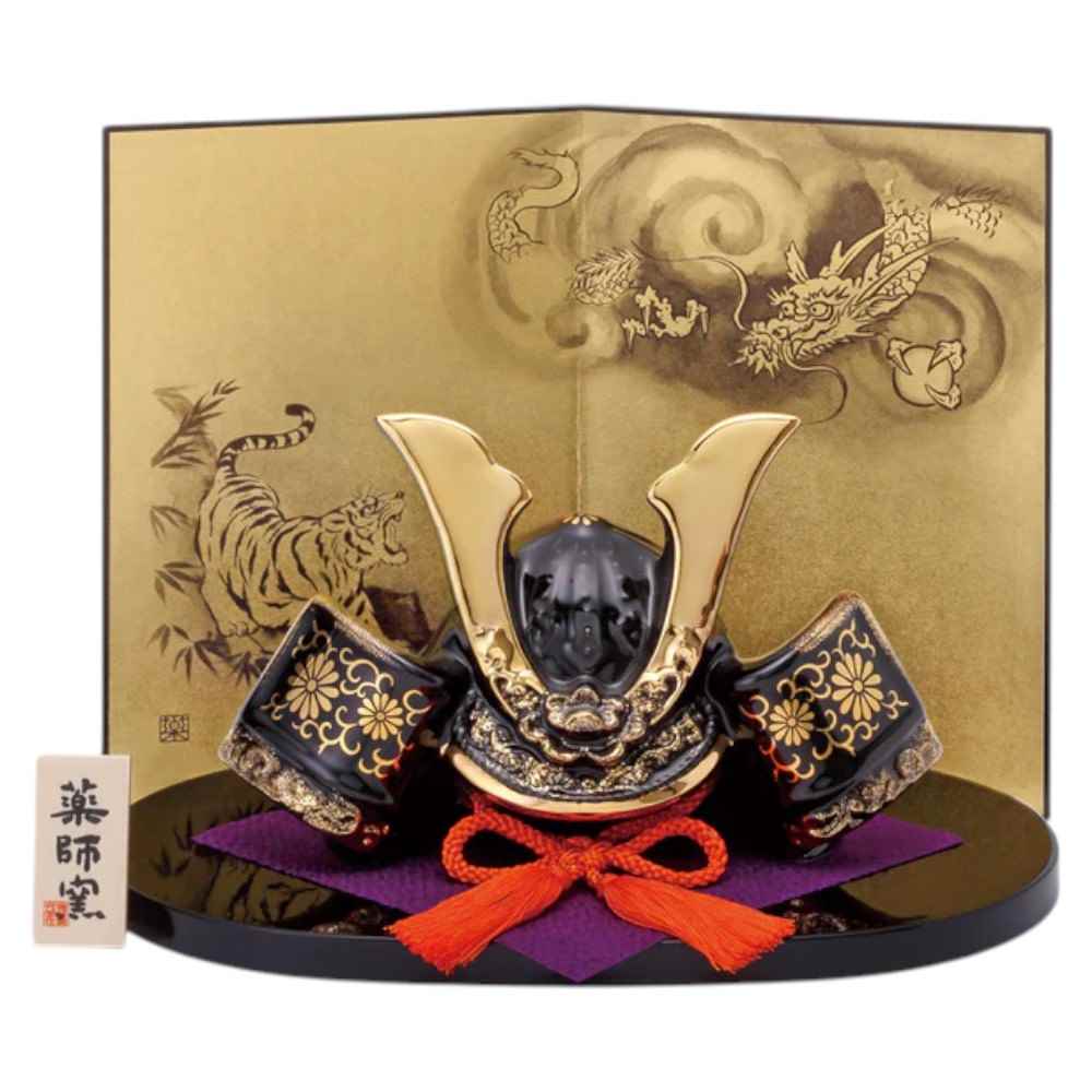 五月人形 コンパクト 陶器 小さい 兜 かぶと/ 金彩出世兜(菊唐草・龍虎屏風付) /こどもの日 端午の節句 初夏 お祝い 贈り物 プレゼント