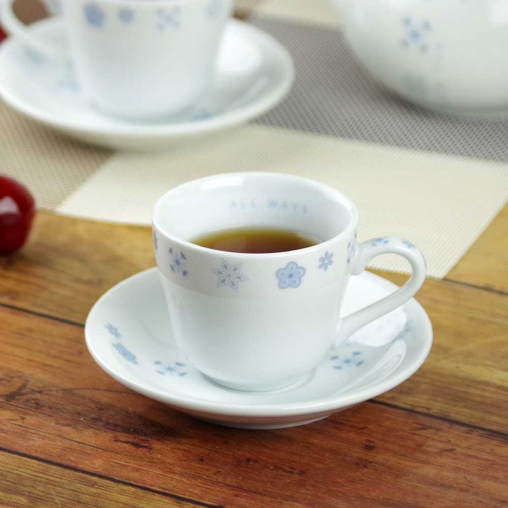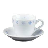 真っ白な生地に小さなお花と雪の結晶が描かれた、とてもかわいいデミタスカップ&ソーサーです。