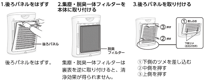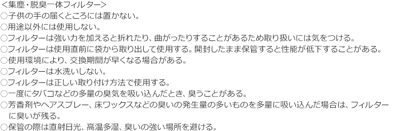 「集塵タイプ」「脱臭タイプ」どちらのフィルターも、汗のニオイや食物の腐敗臭などの気になるニオイを取り除きます。