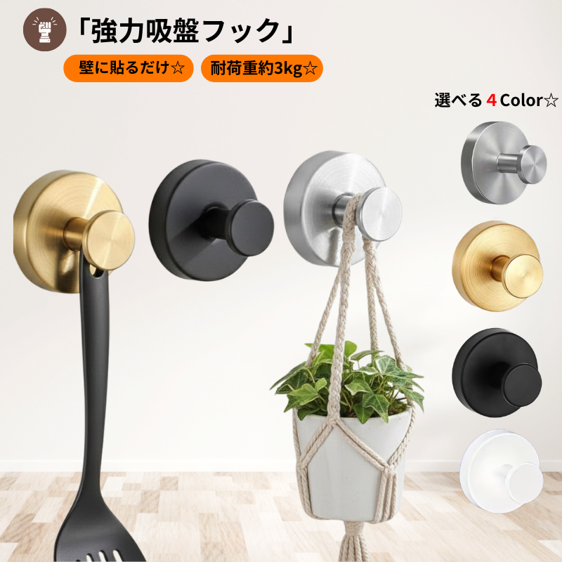 吸盤フック 強力 おしゃれ ステンレス フック 壁 吸盤 穴あけない 超強力 賃貸 キッチン お風呂 バスルーム 浴室 壁掛け はがせる 強力吸着 繰り返し使える 取り付け簡単 穴あけ不要 吸着フック 小 3kg シルバー ホワイト ブラック ゴールド