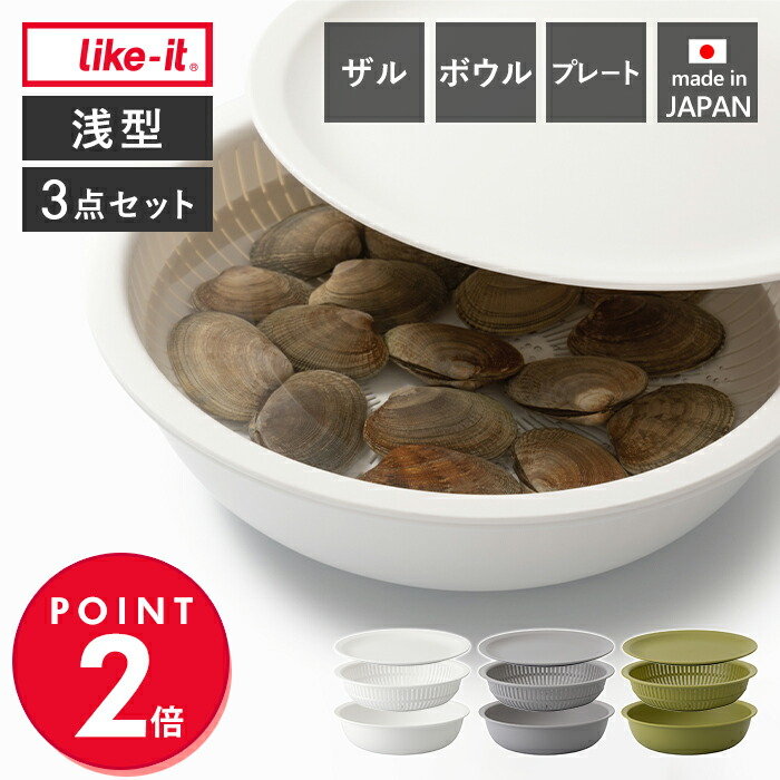商品名ライクイット 米とぎにも使えるザルとボウル (浅型)3点セット