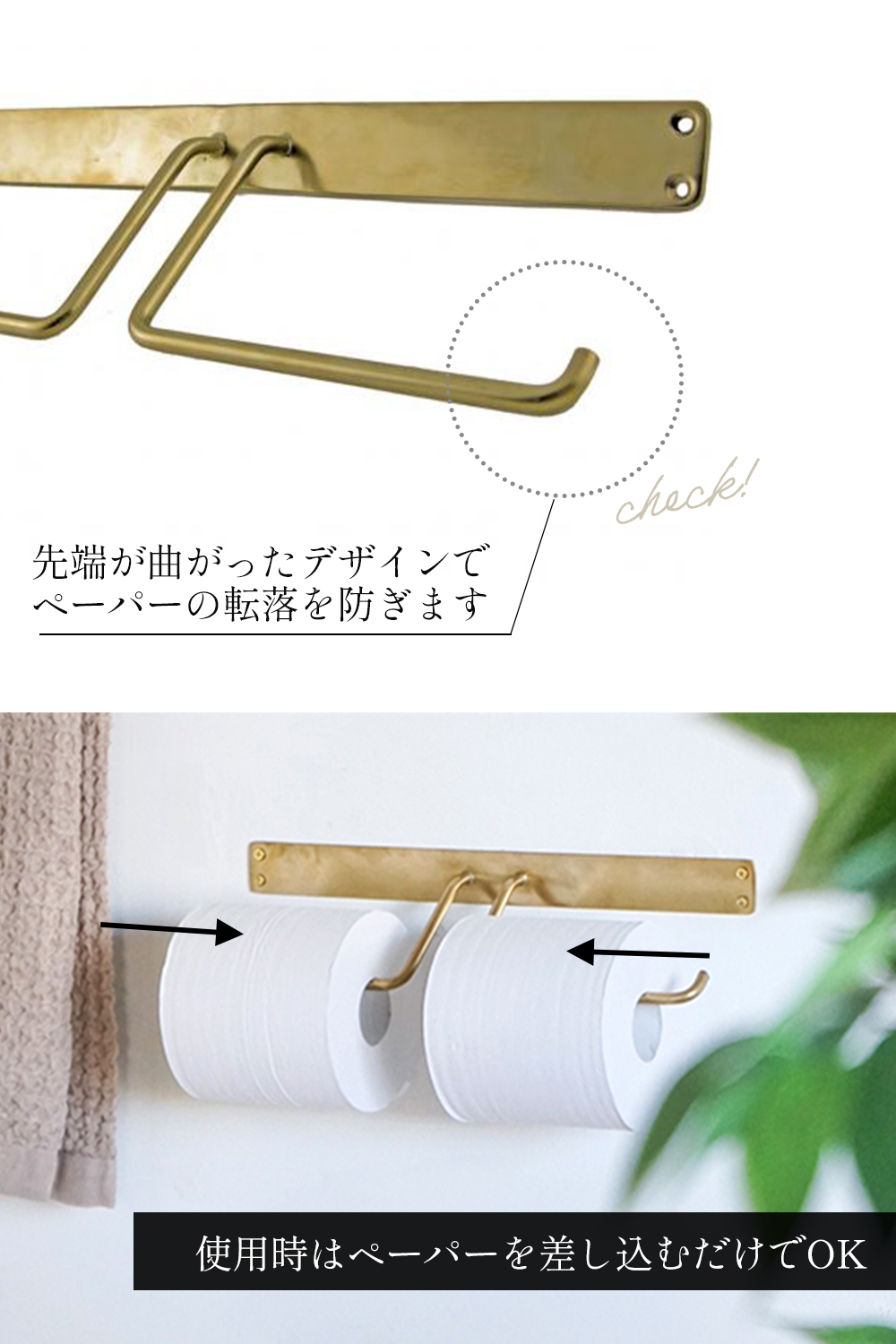 使用時はペーパーをサイドから差し込むだけで設置完了。バーの先端が曲がったデザインなので、ペーパーが転落せずに快適に使えます。取り換えの時も気軽にできるのがポイント。