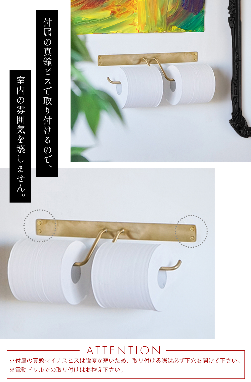 ※付属の真鍮ビスは強度が弱いので、取り付ける際は必ず下穴を開けてください。