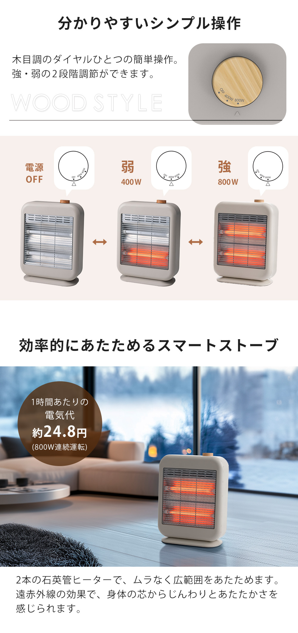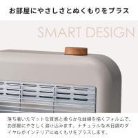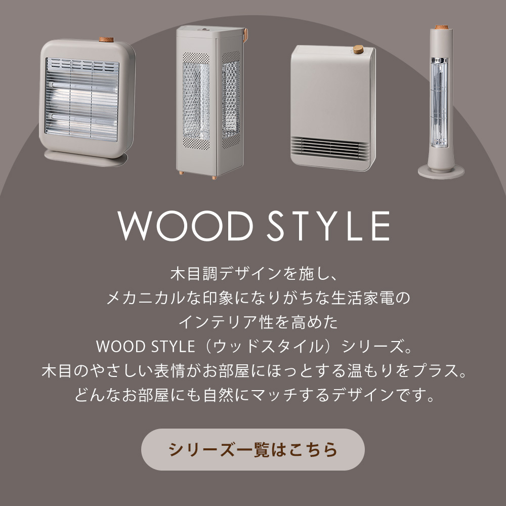マットな質感・柔らかな曲線フォルム・木目調ダイヤル。メカニカルな印象になりがちな生活家電のインテリア性を高めたWOOD STYLE(ウッドスタイル)シリーズの「スマートストーブ」。おしゃれな見た目ながら、機能性や安全性にもこだわりました。ダイヤルひとつの簡単操作で強・弱の2段階調節が可能。2本の石英管ヒーターで、ムラなく広範囲をあたためます。コンパクトサイズのため、限られたスペースにも設置しやすく、収納もスムーズ。裏面コード収納や取っ手付きで軽量なため、シーズンオフの片付けもラクラクです。サーモスタット機能や転倒時自動OFF機能も搭載した安全設計のため、安心してお使いいただけます。