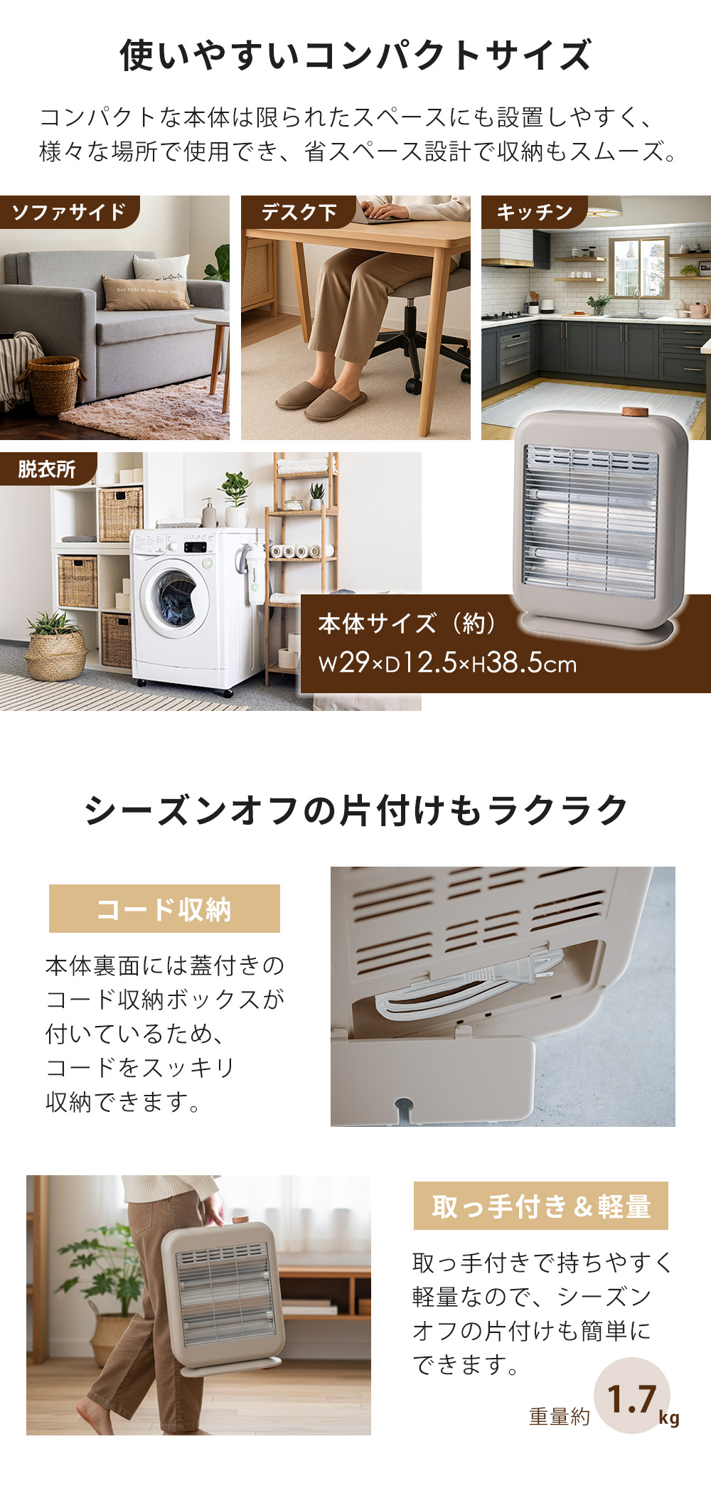 2段階調節 コード収納 かわいい サーモスタット 安全設計 レトロ ミニ 取っ手付き 転倒オフ ナチュラル デザイン 足もと暖房 脱衣所 洗面所 デスク ダイニング リビング トイレ キッチン オフィス コードボックス デスクワーク 在宅勤務 寒さ対策