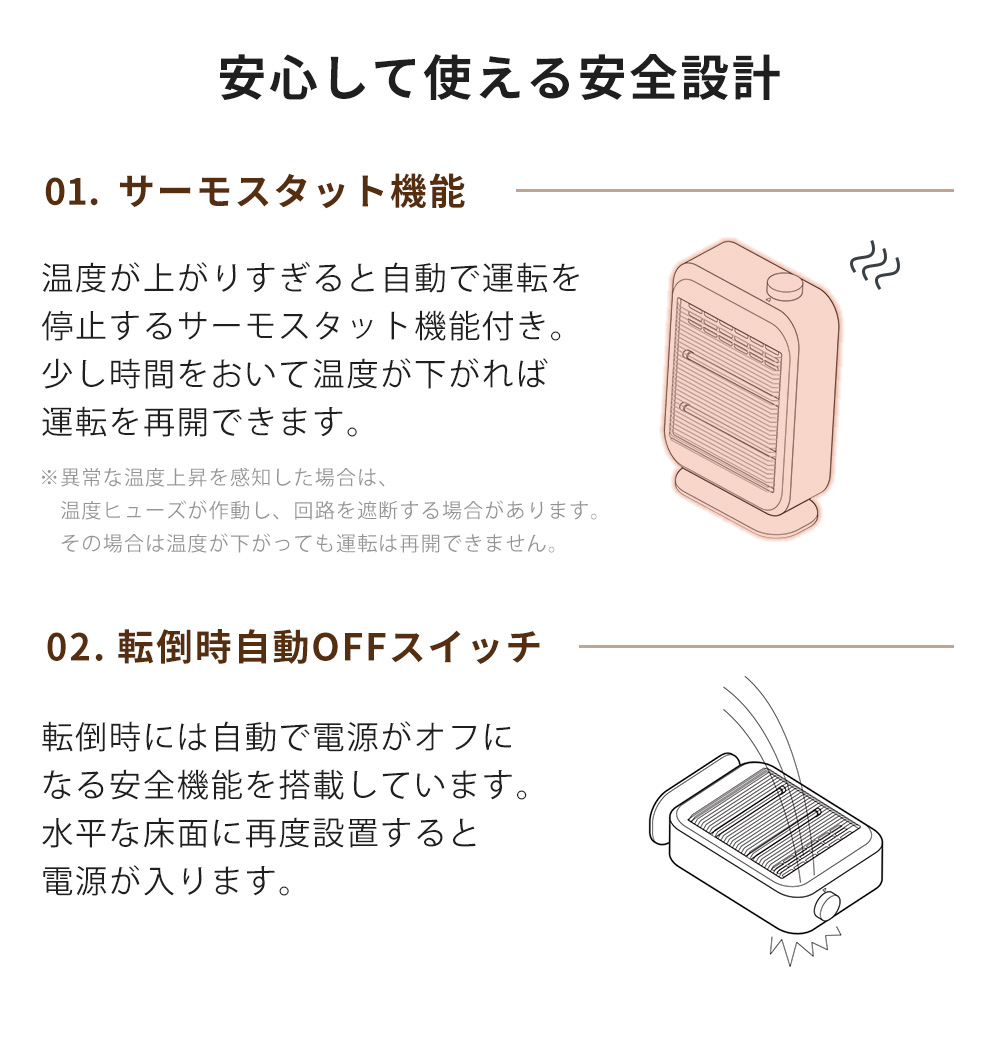 安全装置温度ヒューズ、サーモスタット、転倒時自動オフスイッチ