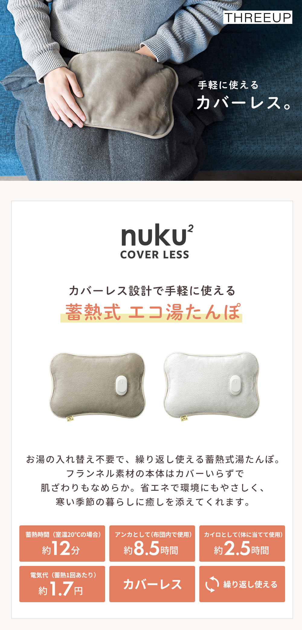 蓄熱式 エコ 湯たんぽ ぬくぬく カバーレス 充電式 カイロ 電気 コードレス あんか 防寒 冷え性 暖房 冬 EWT-2532 THREEUP スリーアップ
