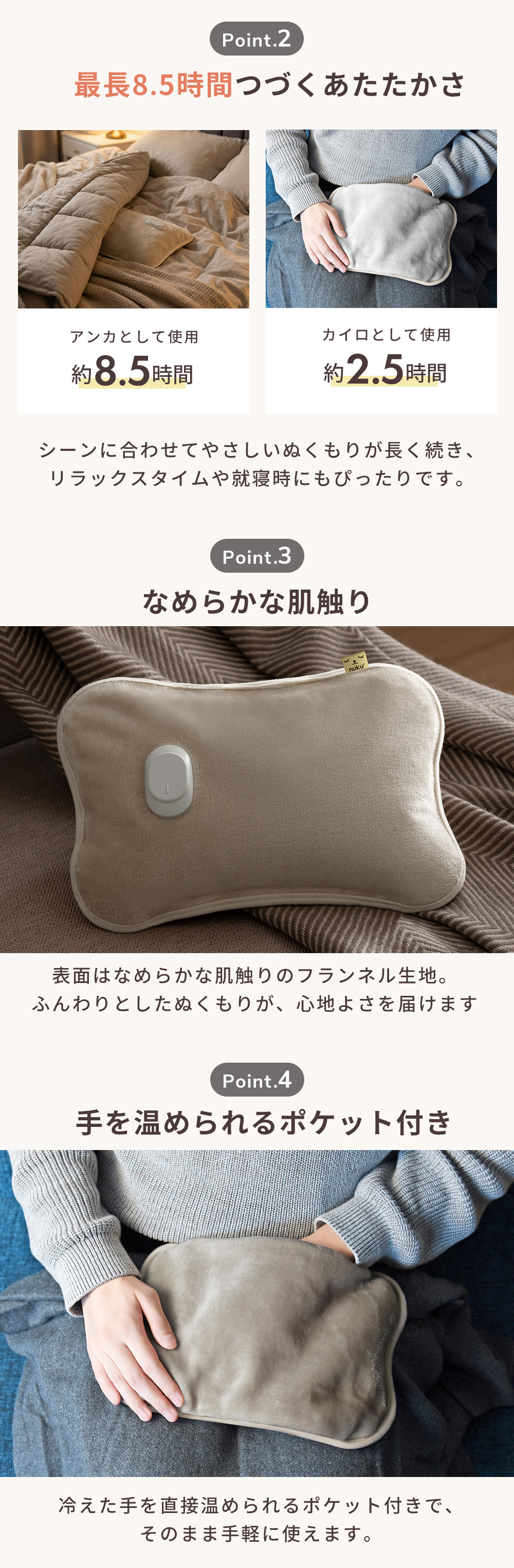 コードレスでどこへでも持ち運べる蓄熱式エコ湯たんぽ「ぬくぬく」。約12分の蓄熱で最長8.5時間じんわり暖かさが続き、お湯の入れ替えは要りません。フランネル素材の本体はカバーいらずで肌ざわりもなめらか。冷えた手を直接温められるポケット付きで、そのまま手軽に使えます。様々なシーンに対応し、冷え対策にぴったり。コンセント不要で使えるため、リビングや寝室、オフィスでも活躍します。入浴中や就寝前に蓄熱しておけば、朝までぬくもりが続きます。