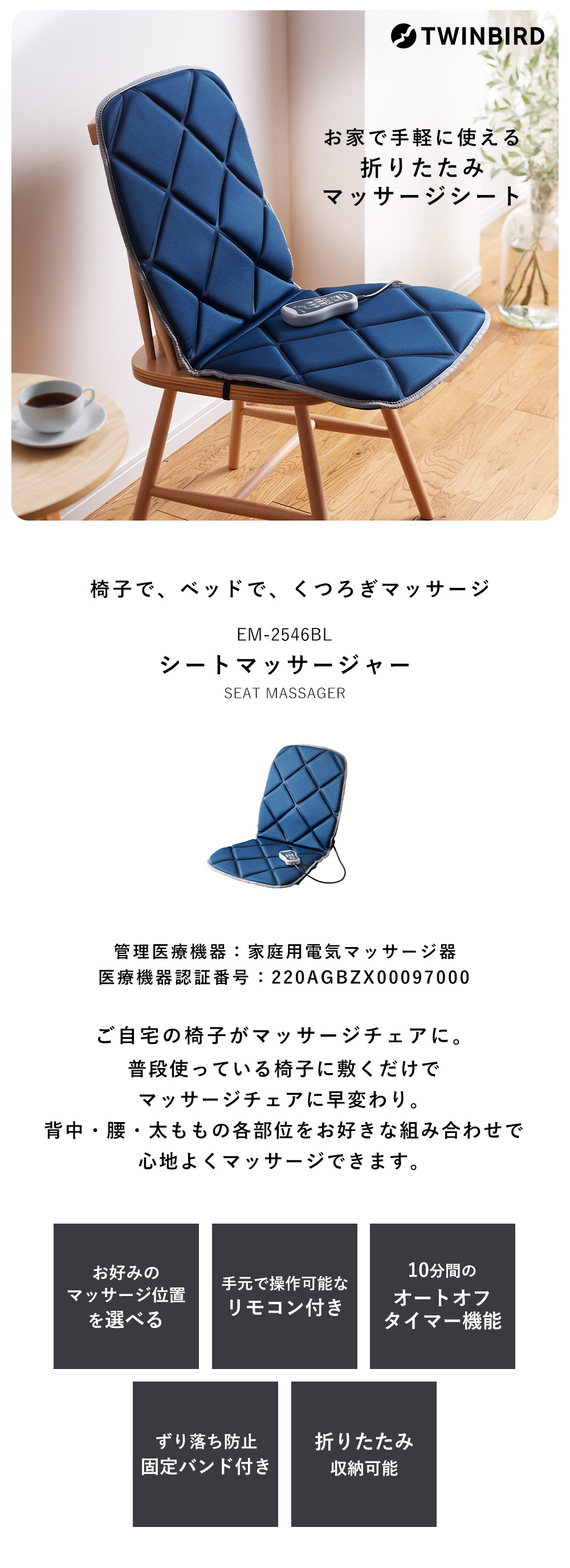 シートマッサージャー 振動 マッサージ器 椅子 ソファ 腰 背中 太もも 簡単 おしゃれ シンプル 手軽 ブルー EM-2546 ツインバード TWINBIRD