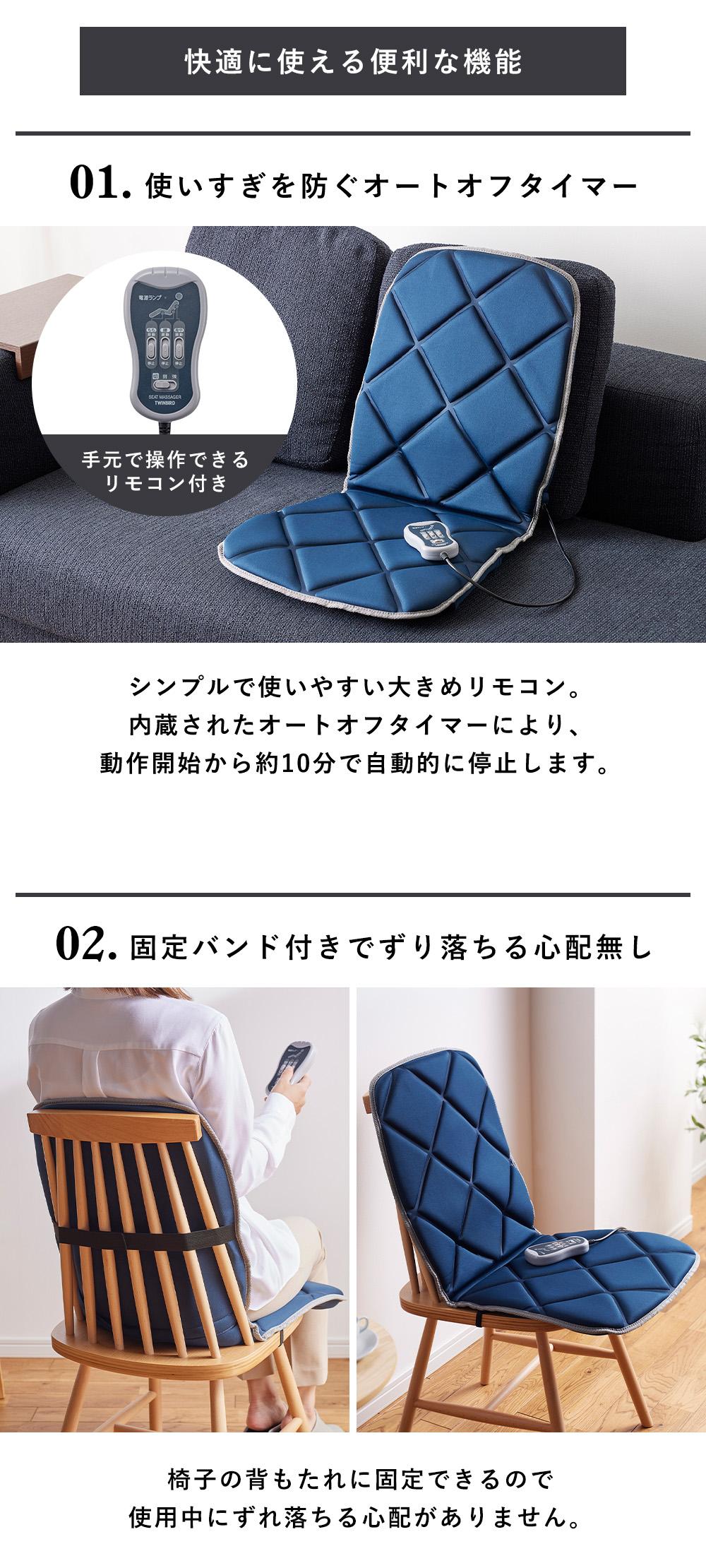 お家の椅子やベッドに敷くだけで手軽に使える折りたたみ式シートマッサージャー。普段使っている椅子がそのままマッサージチェアに早変わりし、背中・腰・太ももを心地よくほぐします。疲労回復や血行促進、コリ軽減にも役立ち、仕事や家事の合間のリフレッシュにぴったり。操作は手元のリモコンで簡単に行え、マッサージ位置の選択、強弱切替、各部位のON/OFFの組み合わせは計14パターンの多彩さ。10分オートオフタイマー付きで安心してお使いいただけます。背もたれにしっかり固定できるズレ防止バンドを搭載し、座った状態でも安定。使用しないときは折りたたんでコンパクトに収納可能です。柔らかな起毛素材で、座り心地抜群。リビング、寝室、オフィスなど場所を選ばず使えます。