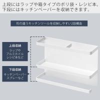 形が違うキッチンツールを収納しやすい2段構造。上段にはラップやアルミホイル・箱タイプのポリ袋・レシピ本などが、下段にはキッチンペーパーやスプレーを収納できます。