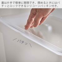 片手で簡単に開閉でき、閉めるときにはパチッとロックできるシリコーンパッキン付きの蓋。お米を湿気と酸化から防いでくれます。全面を開けることができてお米がすくいやすく、90度に開けた状態で上に引き上げれば簡単に取り外すことができます。