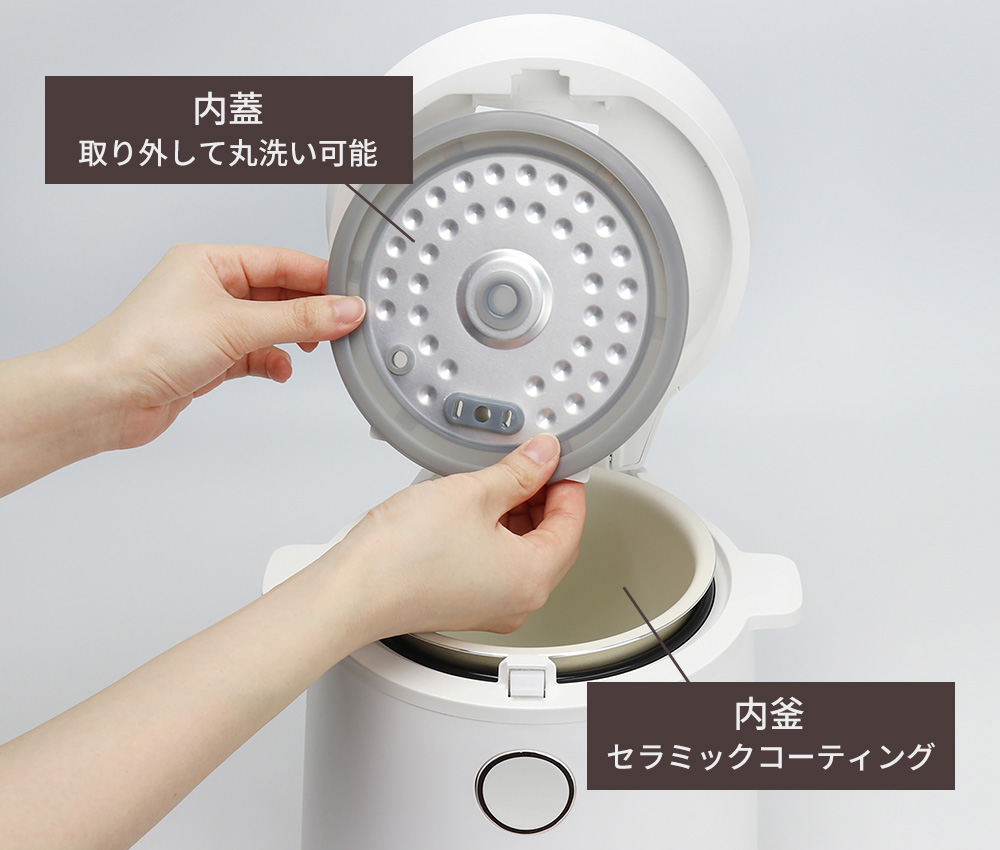 内蓋は取り付け取り外しが簡単でパッと外して水洗いが可能です。内釜はセラミックコーティングが施されていて汚れが落ちやすくお手入れが簡単です。