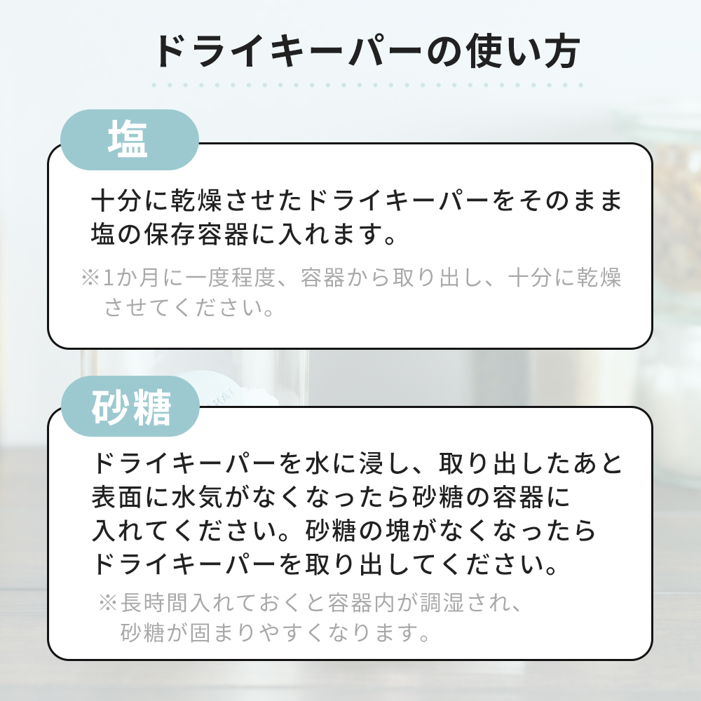 塩・砂糖の保存容器に入れて使う調湿アイテムです。