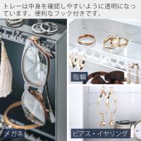 トレーは中身を確認しやすいように透明になっています。便利なフック付きで、フックにはピアスやネックレス、メガネなどを、トレーには指輪やブレスレット、時計などをディスプレイしながら収納できます。