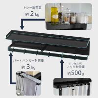 トレー部分の耐荷重は約2kg、バー・ハンガー部分の耐荷重は約3kgととても力持ち。安心してキッチン用品を収納できます。6つ付属の可動式のフックは1つあたりの耐荷重が約500gとなります。