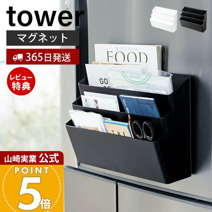 山崎実業 公式 タワー 冷蔵庫横マグネット収納ポケット3段 tower おしゃれ磁石 キッチンラック かご 小物入れ 仕切り付き レシピ 4496 4497