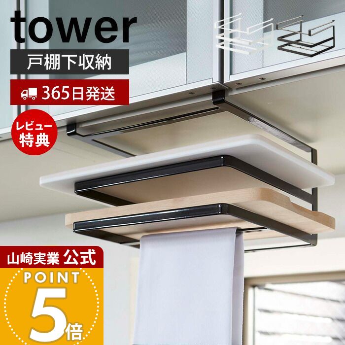 キッチンの吊り下げ戸棚に差し込むだけの簡単設置。置き場に悩むまな板だけでなく、布巾やキッチンタオルもまとめて浮かせる収納ができる便利なハンガーです。
