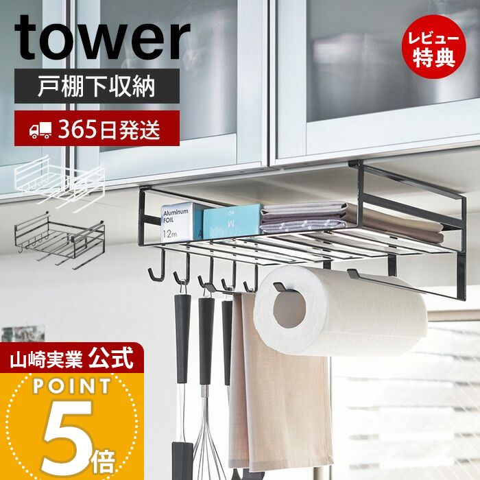キッチンの吊り下げ戸棚に差し込むだけの簡単設置。キッチンでよく使うキッチンペーパー・キッチンツール・ラップ・アルミホイル・ポリ袋・キッチンタオルなどを一つの場所に収納できるラックです。