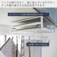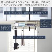 キッチンアイテムを置いて収納できるラックと、キッチンツールなどを掛けて収納できるフックと、キッチンペーパーなどを掛けるハンガーがひとつになった3構造の多機能タイプです。