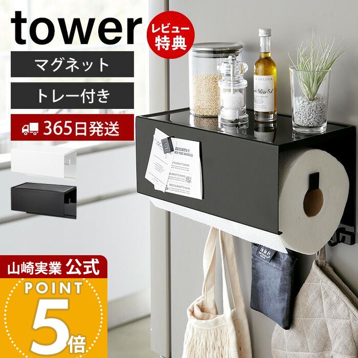山崎実業 公式 タワー マグネットトレー付きキッチンペーパーホルダー tower 大判タイプ トレー付き フック付き カバー 収納 4098 4099