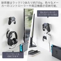 リングタイプのコントローラーも引っ掛けて収納が可能。商品を4個(2セット)使えば、ゲームコントローラー・ヘッドセット・キーボードとゲームに必要な機器がまとめて収納できます。