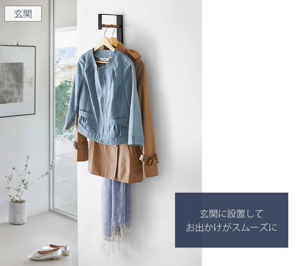玄関に設置すれば、アウターやバッグ、ストールなどお出かけに必要なアイテムをまとめて収納でき、外出時の身支度がスムーズになります。