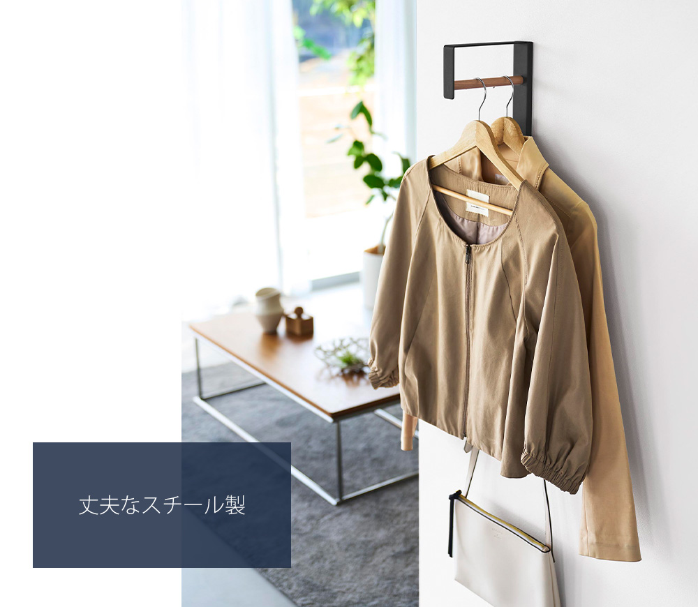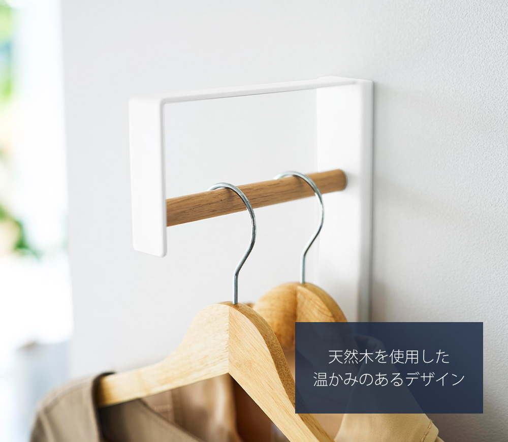ハンガー部には天然木を使用しており、温かみのあるデザイン。シンプルなデザインに木のアクセントが加わり、洗練された空間に仕上がります。