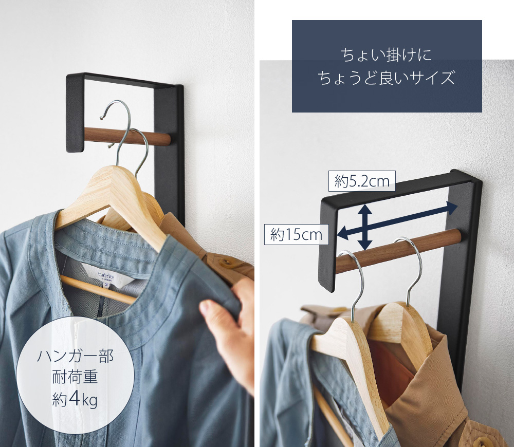 ちょっとしたスペースにも設置しやすく、一時掛けにちょうど良いサイズです。耐荷重は約4kgあり、衣類をしっかり支えます。