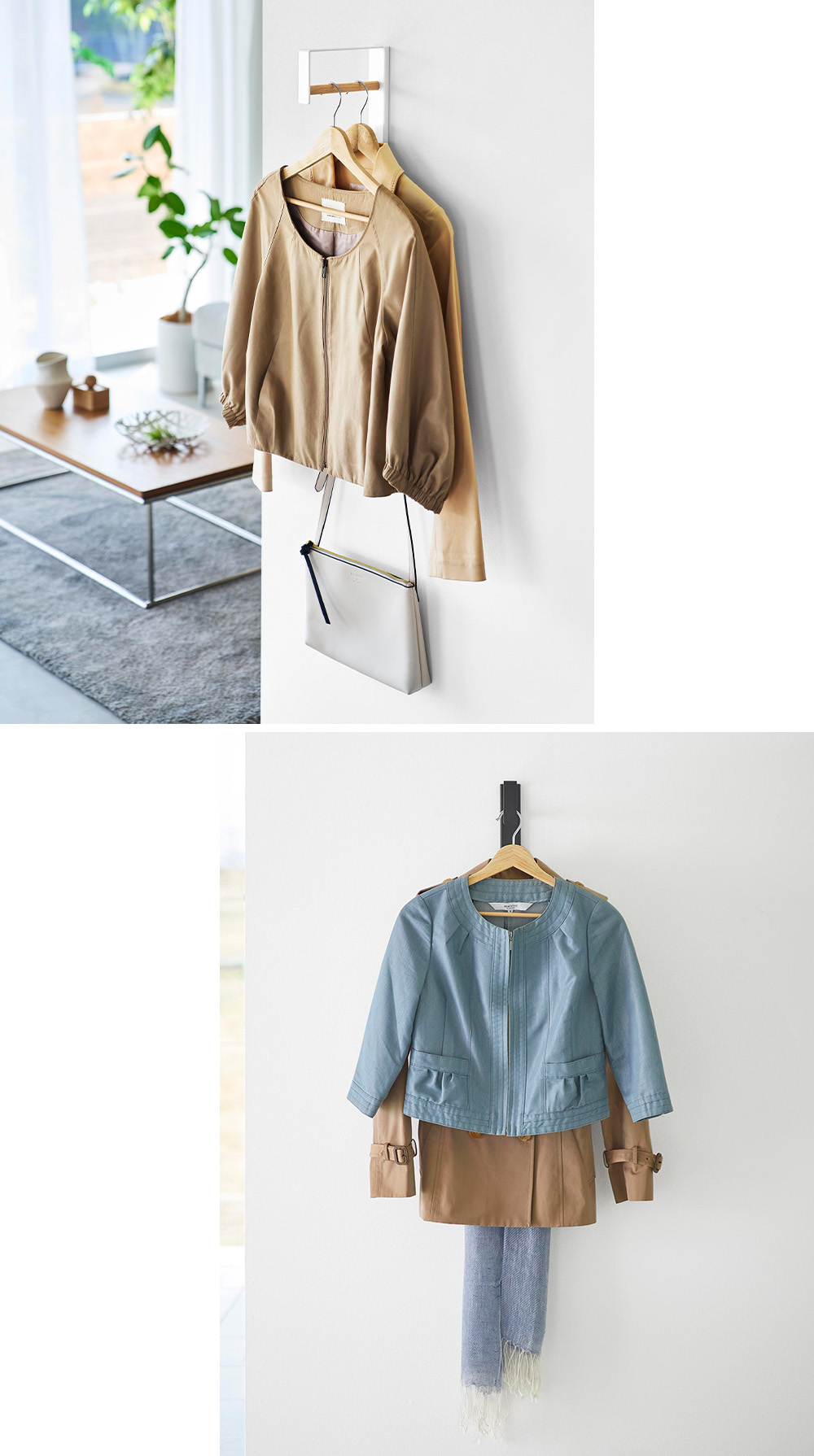 出かける前にサッと手に取れる便利な壁付けハンガー。