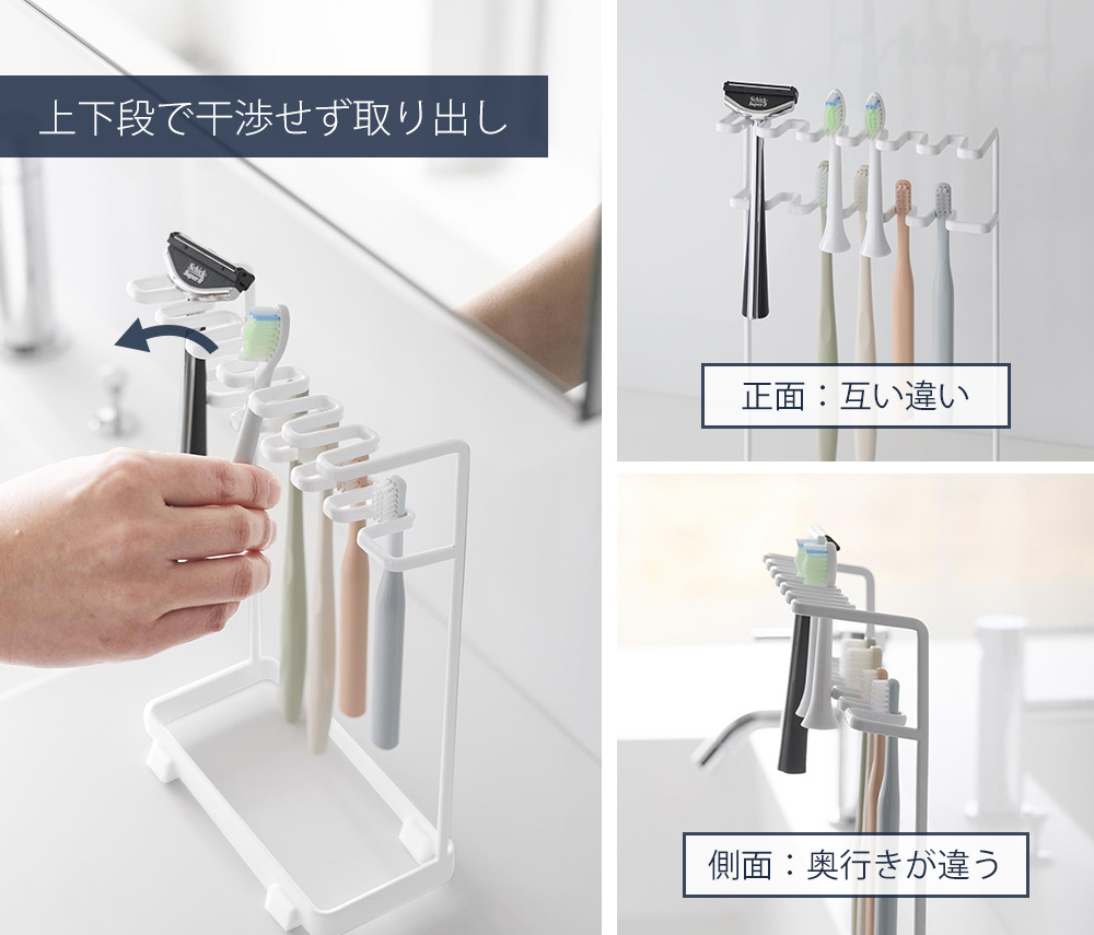 スタンドは2段タイプで、正面から見ると上下で互い違いに、横から見ると奥行きが違うので、歯ブラシ同士が干渉することなく取り出しが可能です。